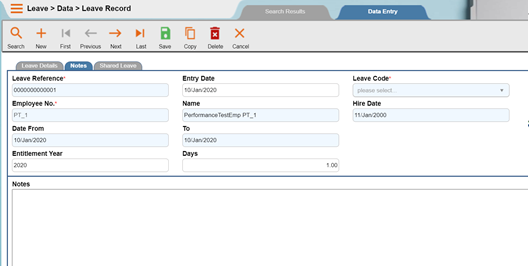 6. Next, click the Notes screen tab in the Leave Record screen. The Notes screen tab will appear as shown below: