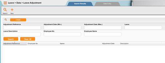 7. Click ‘Save’ button and the ‘New’ button in the toolbar to save and enter each Leave Adjustment record. The ‘Delete’ and the ‘Cancel’ button can be used to cancel records.