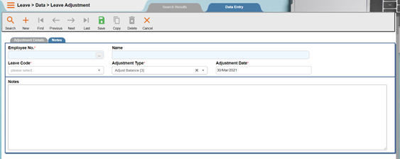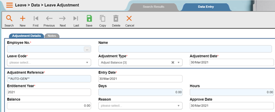 4. To create a new leave record, click the ‘New’ button in the toolbar. Enter the values for the fields in the Adjustment Detail screen tab:
