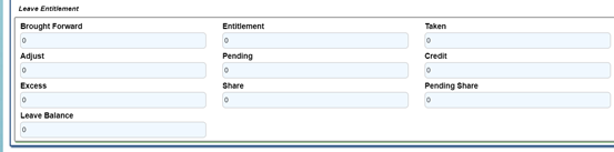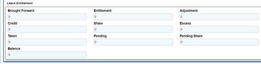 The bottom half of the Leave Record screen will refresh with updated values for the entitlement fields after the Year value is entered.