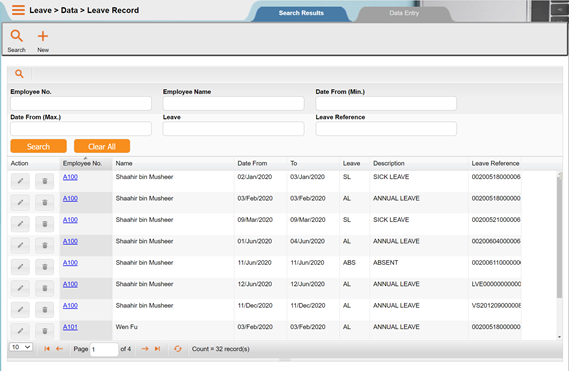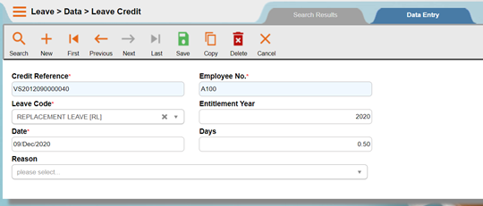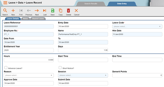 In Enterprise, the user can view existing Leave records for editing, and create new Leave records for employees. A Leave record is created when an employee has been approved by his/her supervisor. When the Leave record is saved, Leave Entitlement field values will be automatically updated in the Leave record screen.