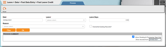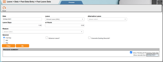 Leave data and leave credit can be updated simultaneously for a group of filtered leave records through fast data entry. Two options are grouped under Fast Data Entry; Fast Leave Data and Fast Leave Credit.