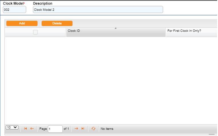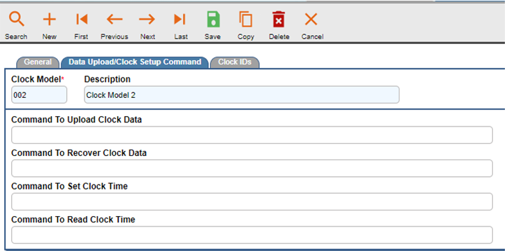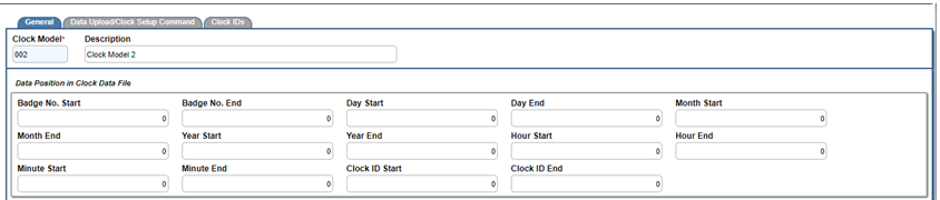 - This field displays the clock model that your company is using. This field cannot be changed after saved. User can enter up to 3 characters for the clock model.