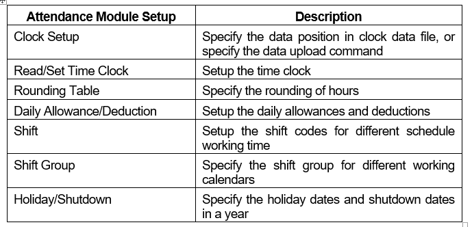 Attendance module contains setup used in other parts of the system. This Attendance module requires the following information to be setup before processing the attendance.