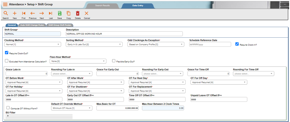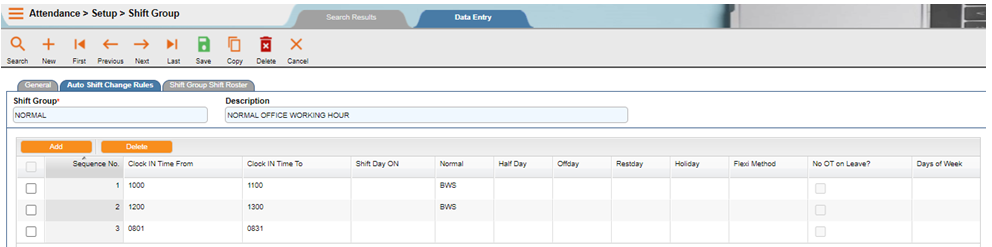 Auto Shift Change will automatically change the shift code according to the clock time rules that have been set here. The benefit of this Auto Shift Change is user can save the time without changing the shift code individually whenever there is shift change between employees. However, there will have some limitations when dealing overtime before start of shift, especially when the start time of overtime work corresponds to start time of another shift code.