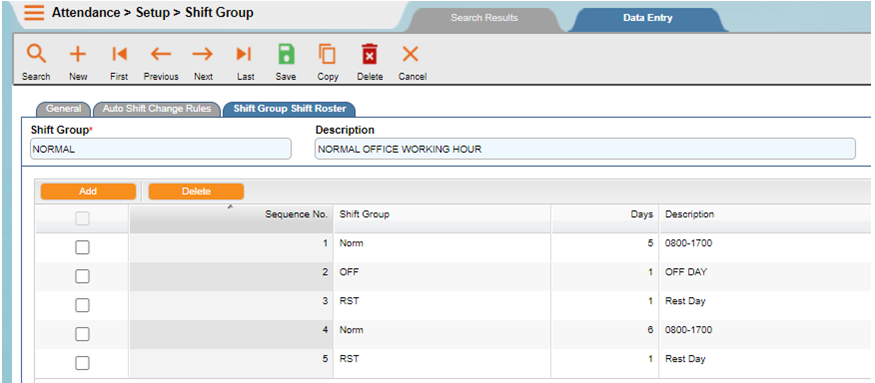 To define shift group shift roster under Attendance > Setup > Shift group, you are required to enter the schedule reference date. System will refer to this reference date as a start date to count the number of days defined in roster schedule. The shift roster patterns should be in repeating sequence.