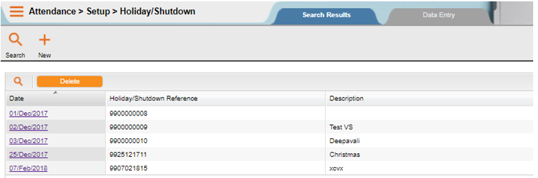 3. The Holiday/Shutdown screen will be shown as the following. Click on the ‘New’ button to add new record.