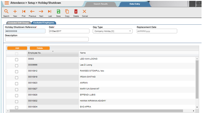 If any employee is excluded from the defined holiday, enter the employee No. of the excluded employees. You have to click on the ‘New’ button to add the employee No. Leave blank if all employees are eligible for the holiday/shutdown.