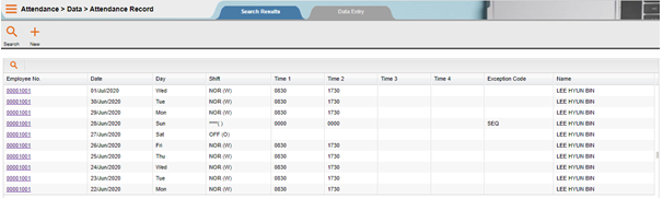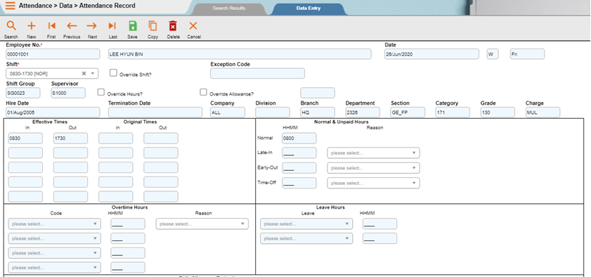 - Check if you are inserting the IN time. System will update the time based on shift code Schedule In time defined in the ATTENDANCE > Setup > Shift.
