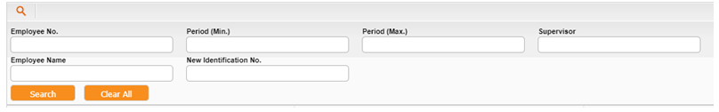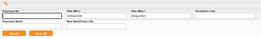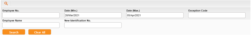 2. Use the List screen to locate the Employee No. or Date (Min) or Date (Max) or Exception Code or Employee Name or Employee New NRIC No.Click on the ‘SEARCH’ button.