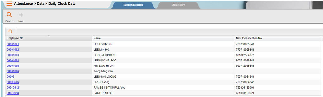 1. Drop down the Data menu and click on Daily Clock Data option. The List screen will appear.