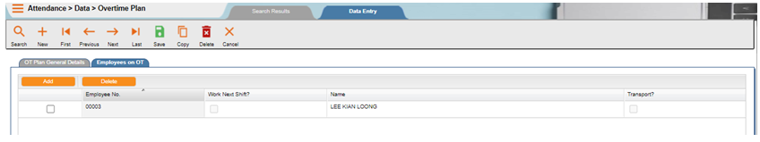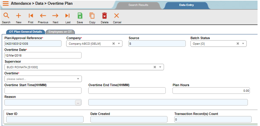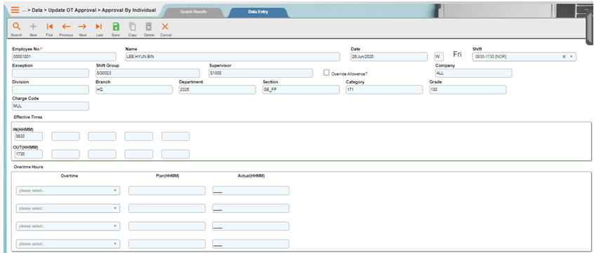 2. The Fast Overtime Approval Entry screen will be shown as the following: