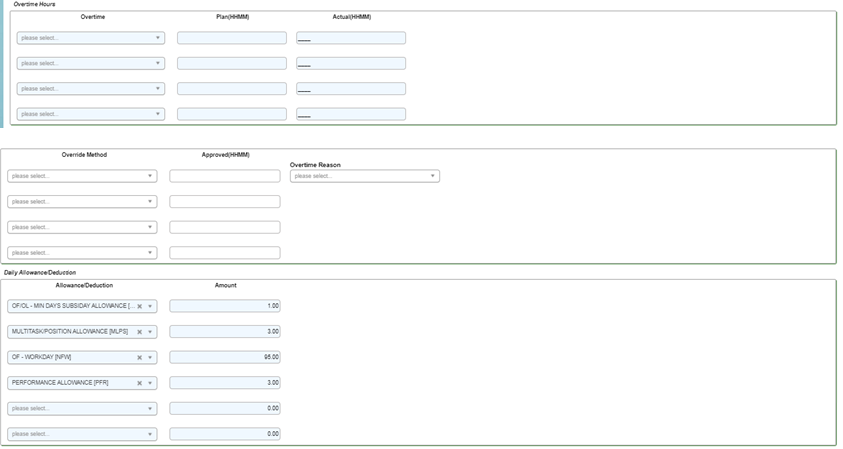- Leave hours are only computed when the employee has a leave form. User can enter up to two leave forms for one day. Tick on the ‘Ovr.Hours?’ checkbox if wish to override the system calculated hours.