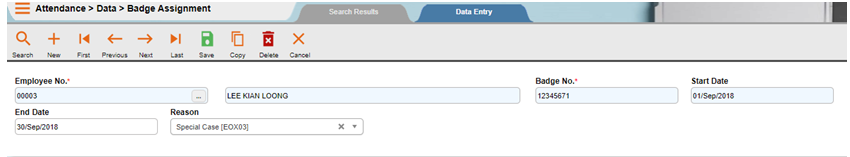 - Enter the badge number of the employee up to 10 characters. This entry optional if you manual input the clock time.