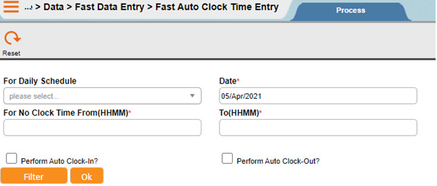 - Enter the range of time for the system to check. Include a ‘-‘ or ‘+’ sign at the back of the time (in HHMM) to indicate previous day or next day respectively. System will insert the clock time if there are no clock time found between the time ranges entered.