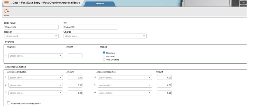 User may use this Fast Overtime Approval Entry option to approve overtime quickly if there is a group of employees who have the same OT, OT hours, allowance or OT reason.