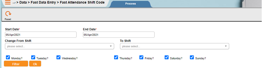 1. Drop down the Data menu and click on Fast Data Entry > Fast Attendance Shift Code option.