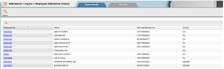 If the entry is not valid, system will indicate a message informing user that there is no record match. Just Click on the ‘SEARCH’ button on the Find dialog and the List screen is displayed. Click to select the employee No.