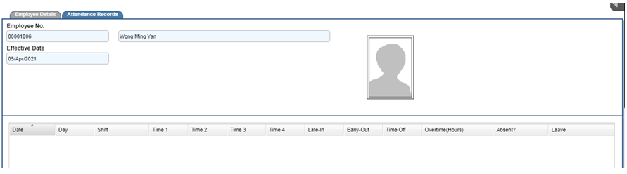 3. The Employee Attendance History screen will be shown as below. The information is organized into 2 different tabs.